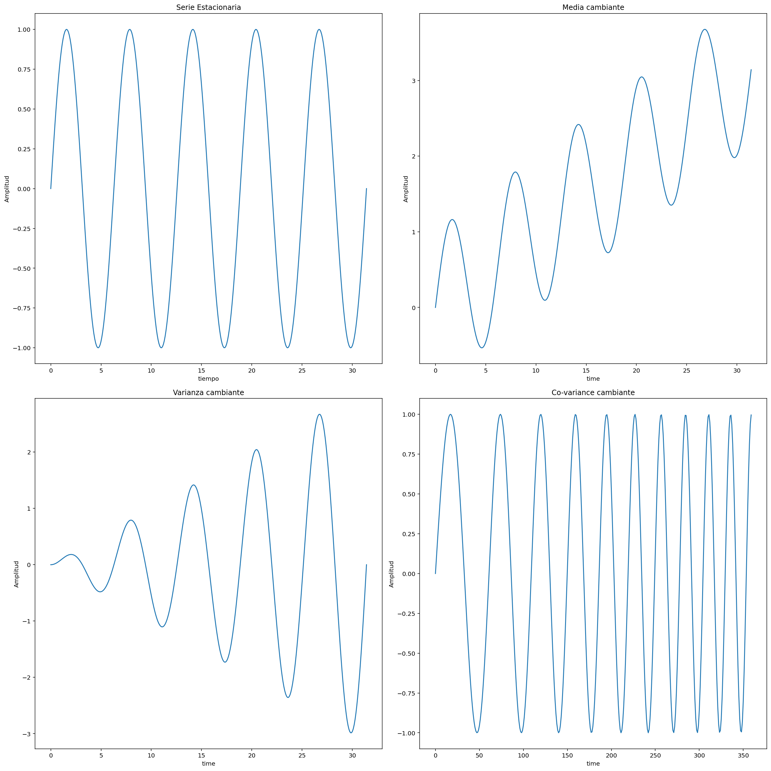 import matplotlib as pltimport matplotlib.pyplot as pltfig, axs = plt.subplots(2, 2, figsize=(18, 18))axs[0][0].plot(x, y)axs[0][0].set_title('Serie Estacionaria')axs[0][0].set_xlabel('tiempo')axs[0][0].set_ylabel('Amplitud')axs[0][1].plot(x, y+x/10)axs[0][1].set_title('Media cambiante')axs[0][1].set_xlabel('time')axs[0][1].set_ylabel('Amplitud')axs[1][0].plot(x, y*x/10)axs[1][0].set_title('Varianza cambiante')axs[1][0].set_xlabel('time')axs[1][0].set_ylabel('Amplitud')axs[1][1].plot(np.sin(x+x*x/30))axs[1][1].set_title('Co-variance cambiante')axs[1][1].set_xlabel('time')axs[1][1].set_ylabel('Amplitud')plt.tight_layout()