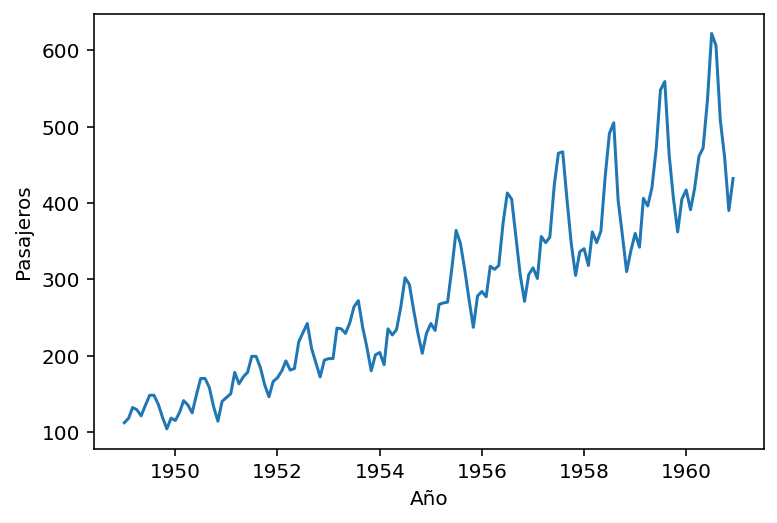 import matplotlib as mplimport matplotlib.pyplot as pltfig, ax = plt.subplots(1, 1)ax.plot(airline.index, airline['Passengers'])ax.set_xlabel('Año')ax.set_ylabel('Pasajeros')
