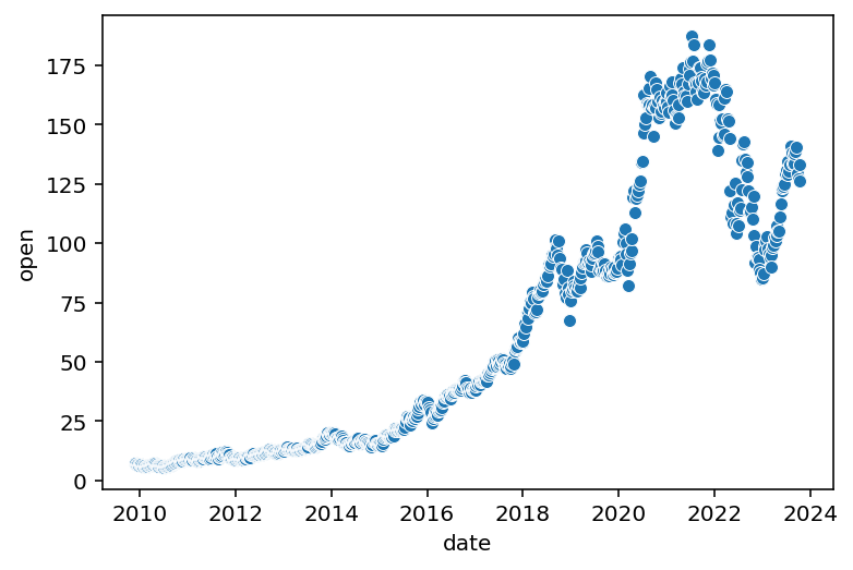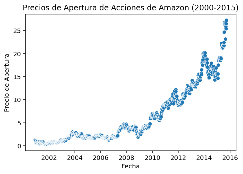 import seaborn as sns# Crea el scatterplotsns.scatterplot(data=amazon_subprime, y="open", x="date")plt.xlabel("Fecha")plt.ylabel("Precio de Apertura")plt.title("Precios de Apertura de Acciones de Amazon (2000-2015)")plt.show()