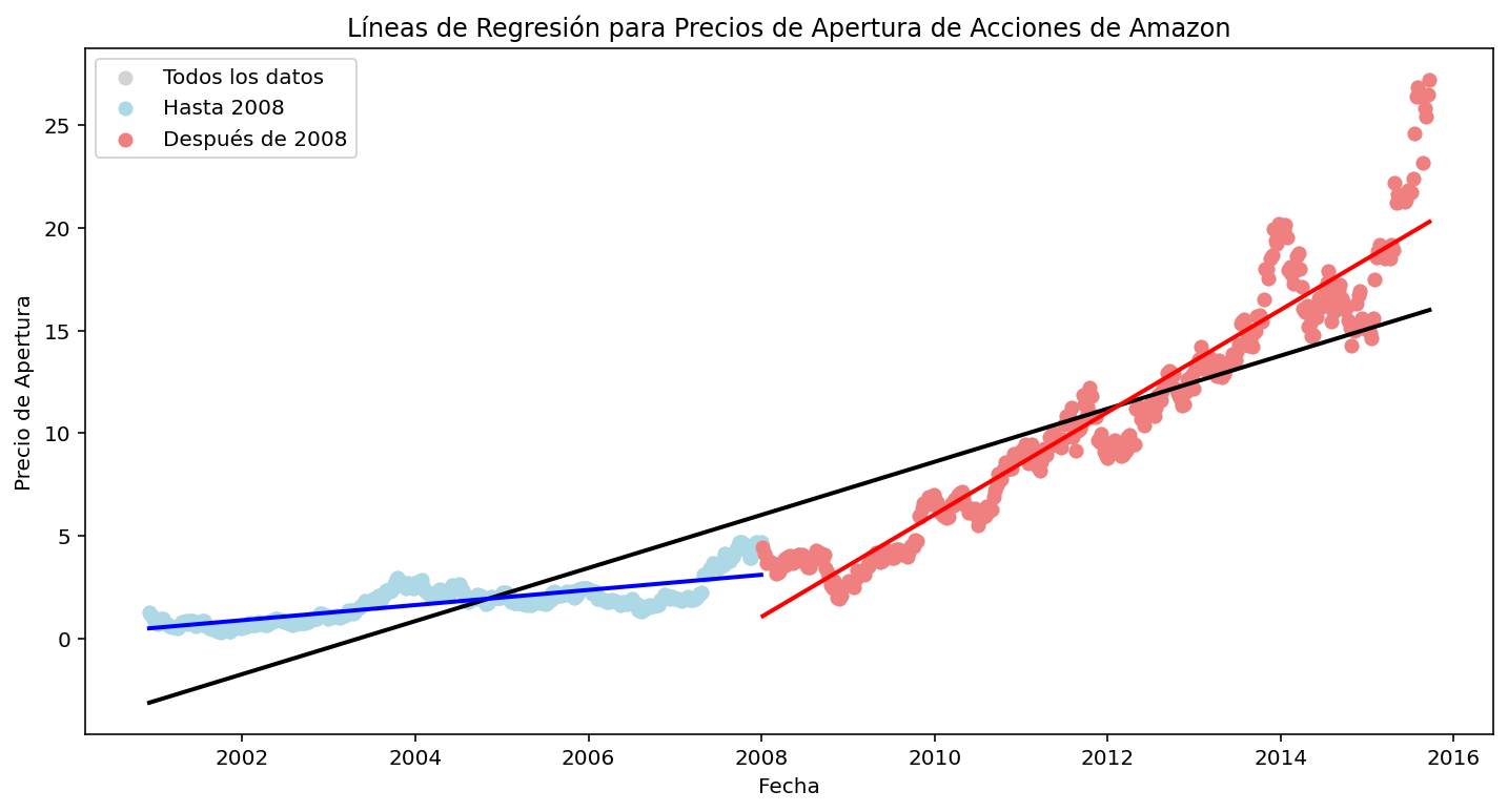 # Dividir los datos en tres conjuntos: antes de 2008, después de 2008 y todos los datosdata_before_2008 = amazon_subprime[amazon_subprime['date'] <'2008-01-01']data_after_2008 = amazon_subprime[amazon_subprime['date'] >='2008-01-01']# Ajustar modelos de regresión lineal para cada conjunto de datosmodel_all_data = sm.OLS(amazon_subprime['open'], sm.add_constant(np.arange(len(amazon_subprime)))).fit()model_before_2008 = sm.OLS(data_before_2008['open'], sm.add_constant(np.arange(len(data_before_2008)))).fit()model_after_2008 = sm.OLS(data_after_2008['open'], sm.add_constant(np.arange(len(data_after_2008)))).fit()