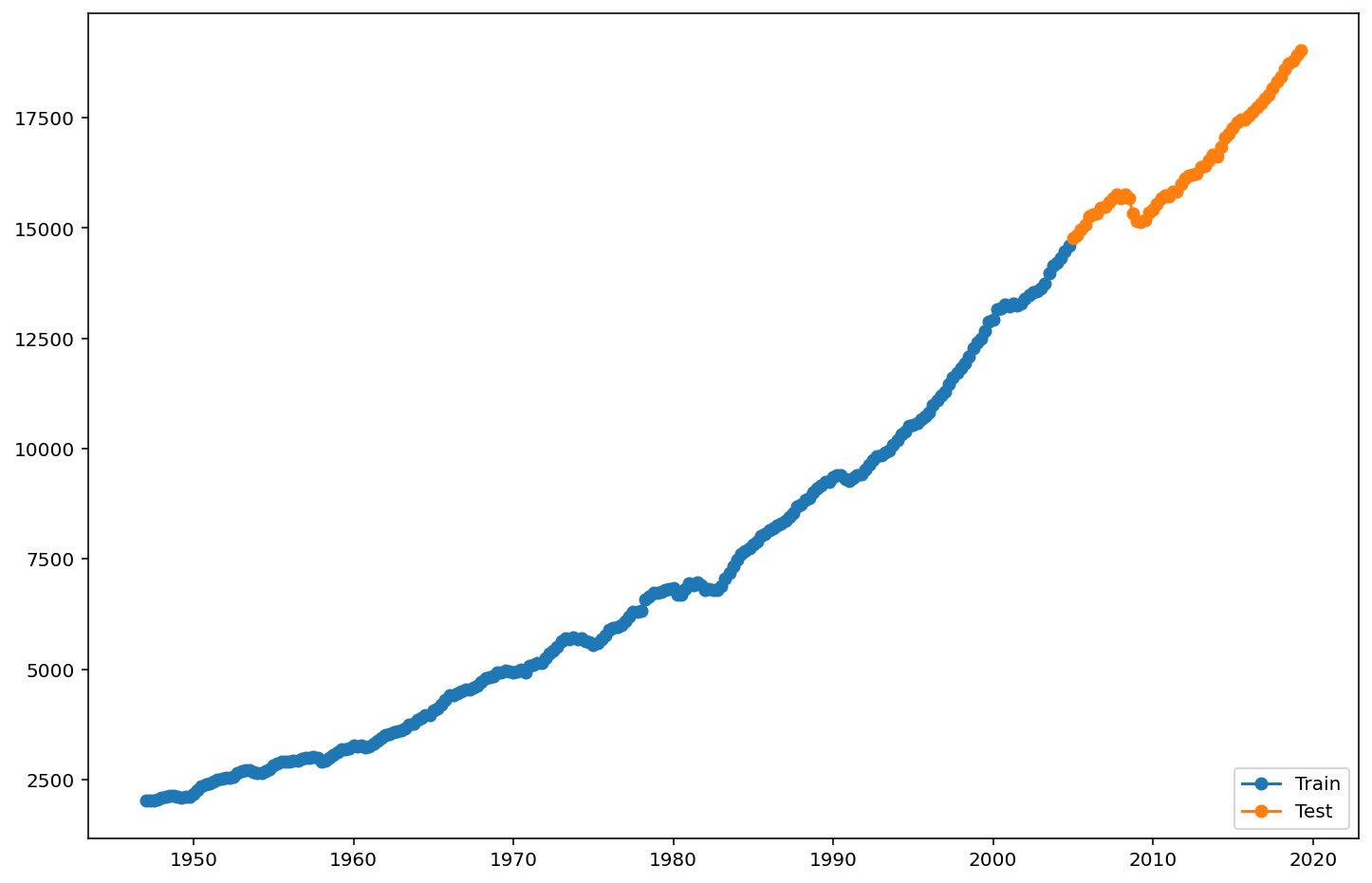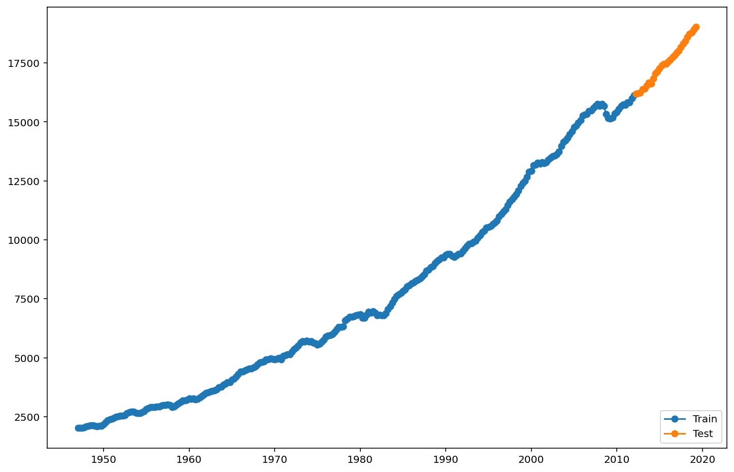 from pandas.tseries.offsets import DateOffsetfuture_dates=[GDP.index[-1]+ DateOffset(years=x)for x inrange(-2,10)]future_datest_df=pd.DataFrame(index=future_dates[1:],columns=GDP.columns)future_datest_df
