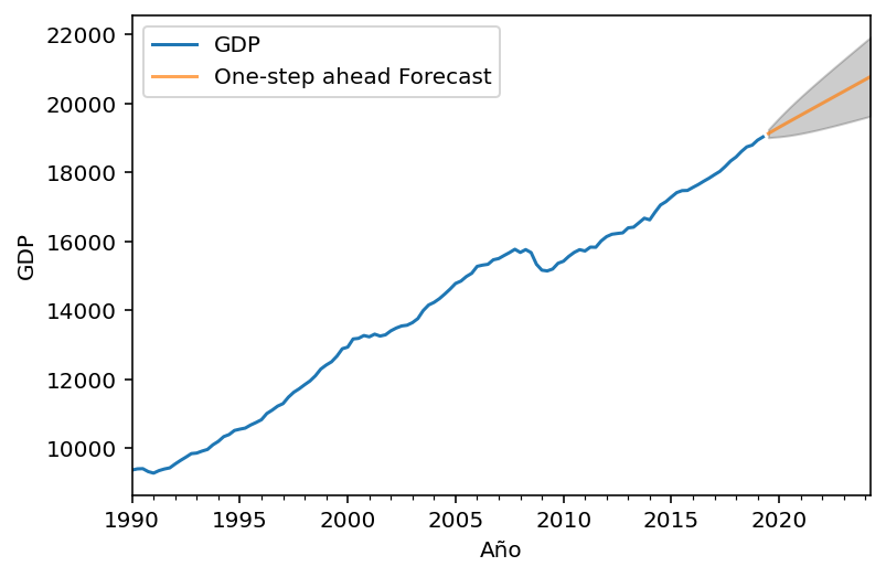 Los modelos ARIMA son muy buenos creando predicciones fuera de muestra en un paso, es decir, el siguiente periodo después de los datos.