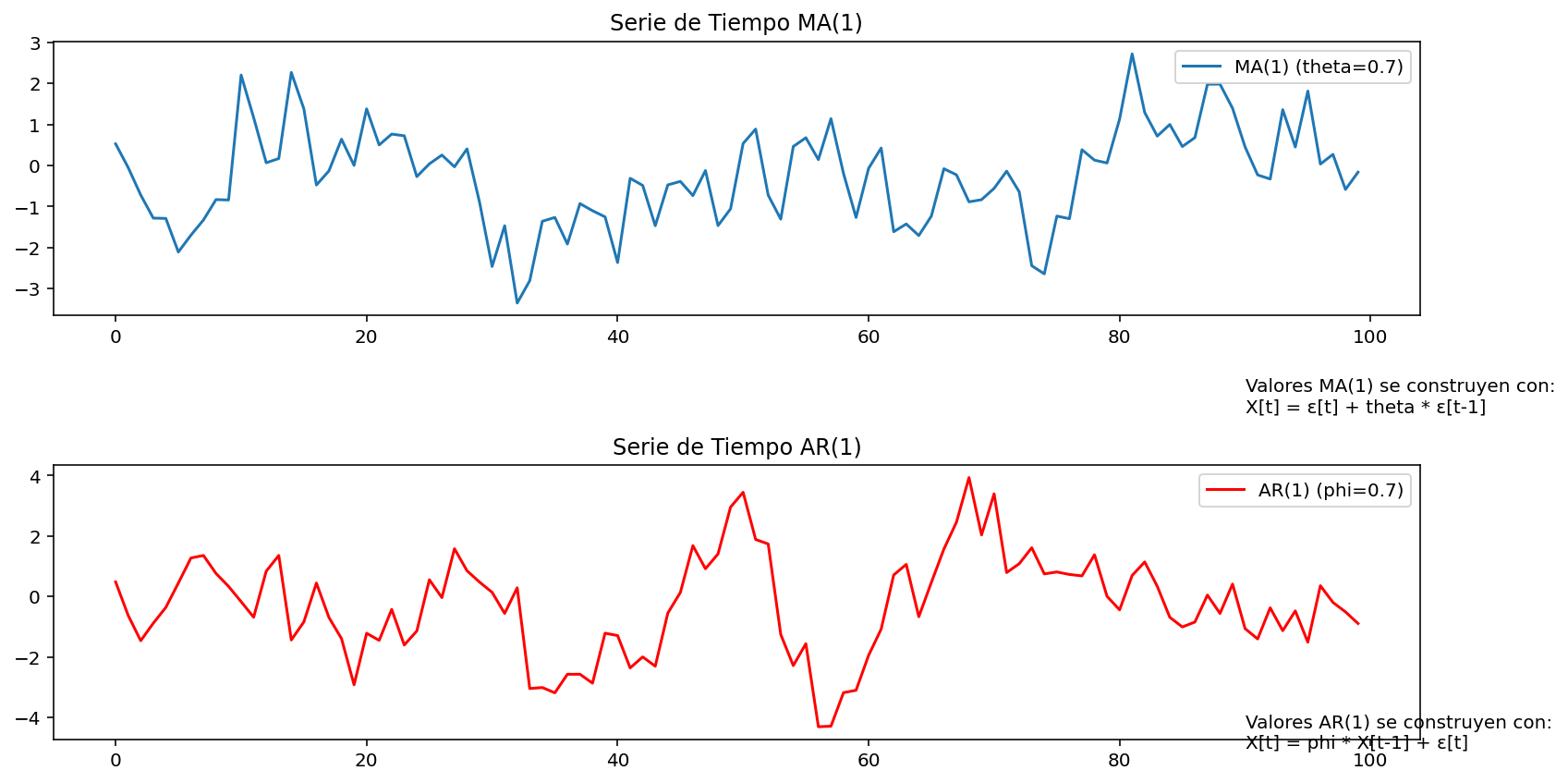 import numpy as npimport matplotlib.pyplot as plt# Parámetros del modelo MA(1)theta =0.7sigma =1n =100# Longitud de la serie de tiempo# Simulación de la serie de tiempo MA(1)ma_series = [np.random.normal(scale=sigma)]for _ inrange(1, n): ma_series.append(np.random.normal(scale=sigma) + theta * ma_series[-1])# Parámetros del modelo AR(1)phi =0.7# Simulación de la serie de tiempo AR(1)ar_series = [np.random.normal(scale=sigma)]for _ inrange(1, n): ar_series.append(phi * ar_series[-1] + np.random.normal(scale=sigma))# Crear gráficosplt.figure(figsize=(12, 6))plt.subplot(2, 1, 1)plt.plot(ma_series, label=f'MA(1) (theta={theta})')plt.title('Serie de Tiempo MA(1)')plt.legend()plt.text(90, -6, 'Valores MA(1) se construyen con:\nX[t] = ε[t] + theta * ε[t-1]')plt.subplot(2, 1, 2)plt.plot(ar_series, label=f'AR(1) (phi={phi})', color='red')plt.title('Serie de Tiempo AR(1)')plt.legend()plt.text(90, -5, 'Valores AR(1) se construyen con:\nX[t] = phi * X[t-1] + ε[t]')plt.tight_layout()plt.show()