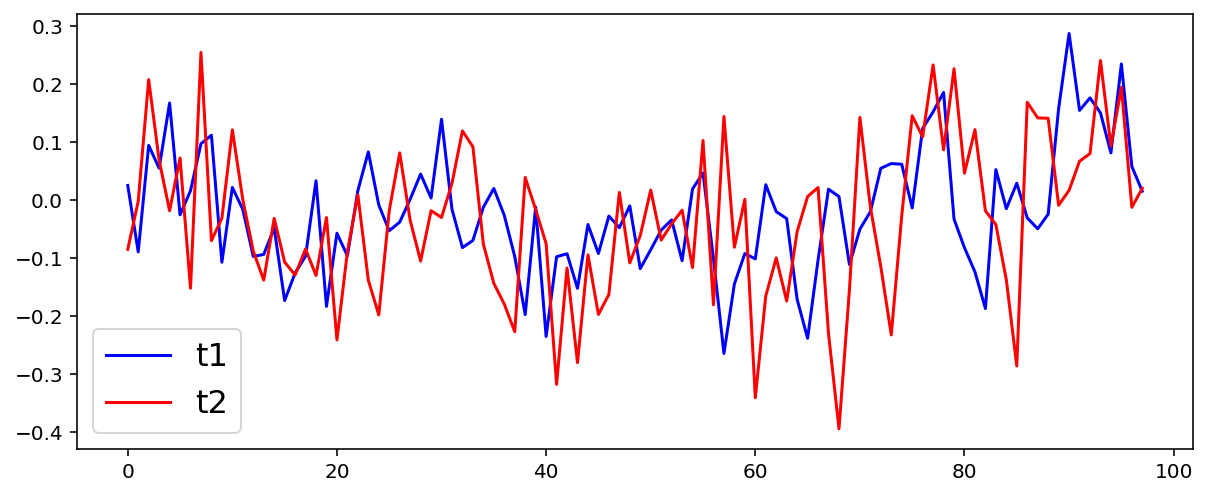 # Construyamos la serie 2 que es granger caused por t1t2 = [item +0.1*np.random.normal() for item in t1]