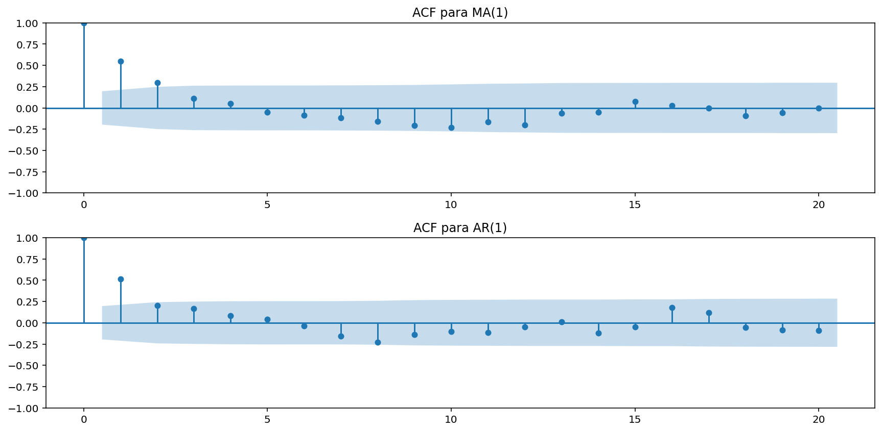 import numpy as npimport matplotlib.pyplot as pltfrom statsmodels.graphics.tsaplots import plot_acf# Parámetros del modelo MA(1)theta_ma =0.5sigma_ma =1n =100# Simulación de la serie de tiempo MA(1)ma_series = [np.random.normal(scale=sigma_ma)]for _ inrange(1, n): ma_series.append(np.random.normal(scale=sigma_ma) + theta_ma * ma_series[-1])# Parámetros del modelo AR(1)rho_ar =0.5sigma_ar =1# Simulación de la serie de tiempo AR(1)ar_series = [np.random.normal(scale=sigma_ar)]for _ inrange(1, n): ar_series.append(rho_ar * ar_series[-1] + np.random.normal(scale=sigma_ar))# Graficar la ACF para MA(1)plt.figure(figsize=(12, 6))plt.subplot(2, 1, 1)plot_acf(np.array(ma_series), ax=plt.gca(), title="ACF para MA(1)")# Graficar la ACF para AR(1)plt.subplot(2, 1, 2)plot_acf(np.array(ar_series), ax=plt.gca(), title="ACF para AR(1)")plt.tight_layout()plt.show()