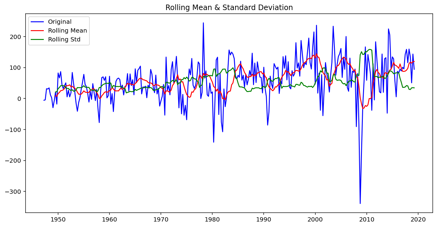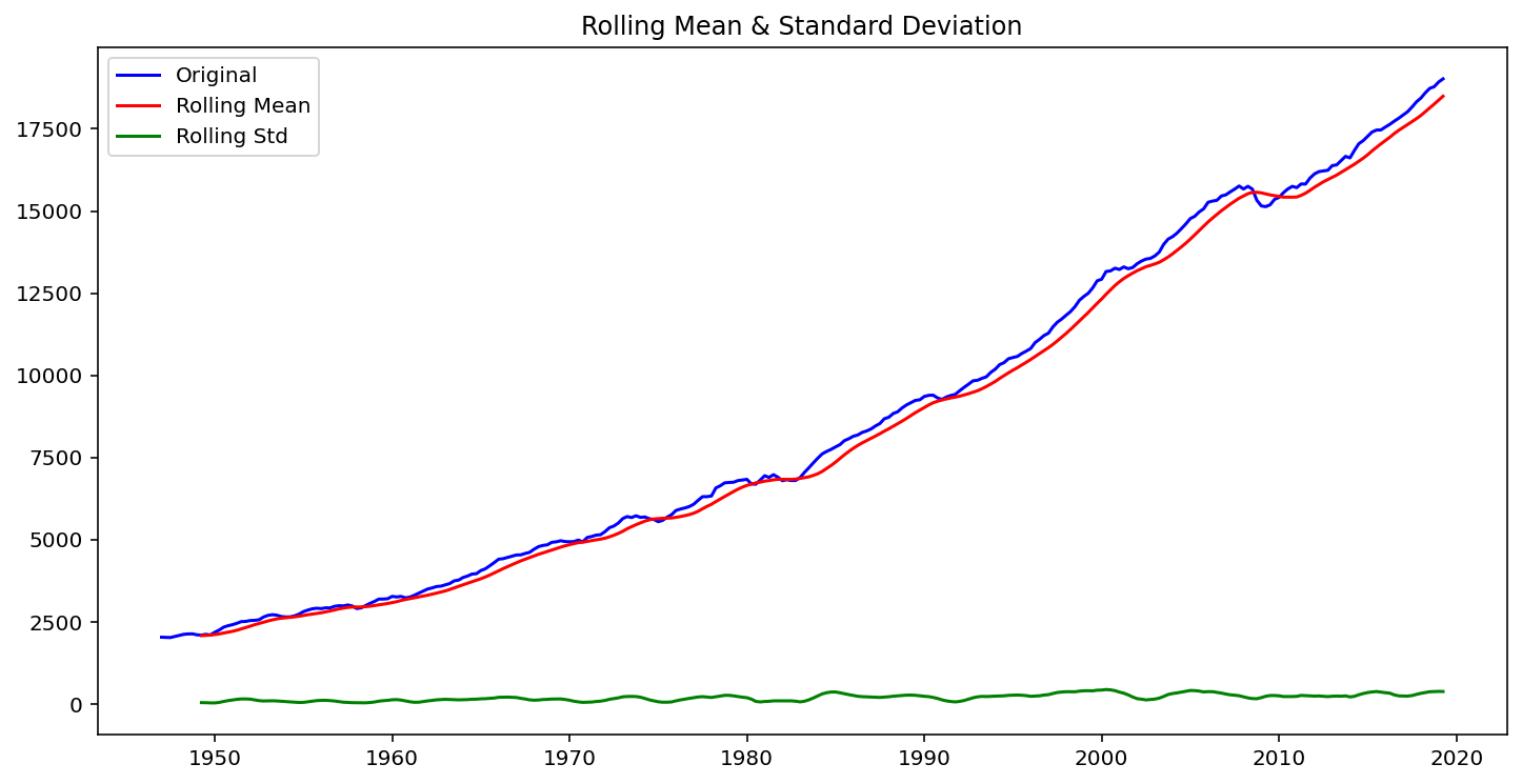 from statsmodels import tsafrom statsmodels.tsa.stattools import adfullerdef stationarity_check(ts, w):# Calculate rolling statistics roll_mean = ts.rolling(window=w, center=False).mean() roll_std = ts.rolling(window=w, center=False).std()# Perform the Dickey Fuller test dftest = adfuller(ts) # Plot rolling statistics: fig = plt.figure(figsize=(12,6)) orig = plt.plot(ts, color='blue',label='Original') mean = plt.plot(roll_mean, color='red', label='Rolling Mean') std = plt.plot(roll_std, color='green', label ='Rolling Std') plt.legend(loc='best') plt.title('Rolling Mean & Standard Deviation') plt.show(block=False)# Print Dickey-Fuller test resultsprint('\nResults of Dickey-Fuller Test: \n') dfoutput = pd.Series(dftest[0:4], index=['Test Statistic', 'p-value', '#Lags Used', 'Number of Observations Used'])for key, value in dftest[4].items(): dfoutput['Critical Value (%s)'%key] = valueprint(dfoutput)