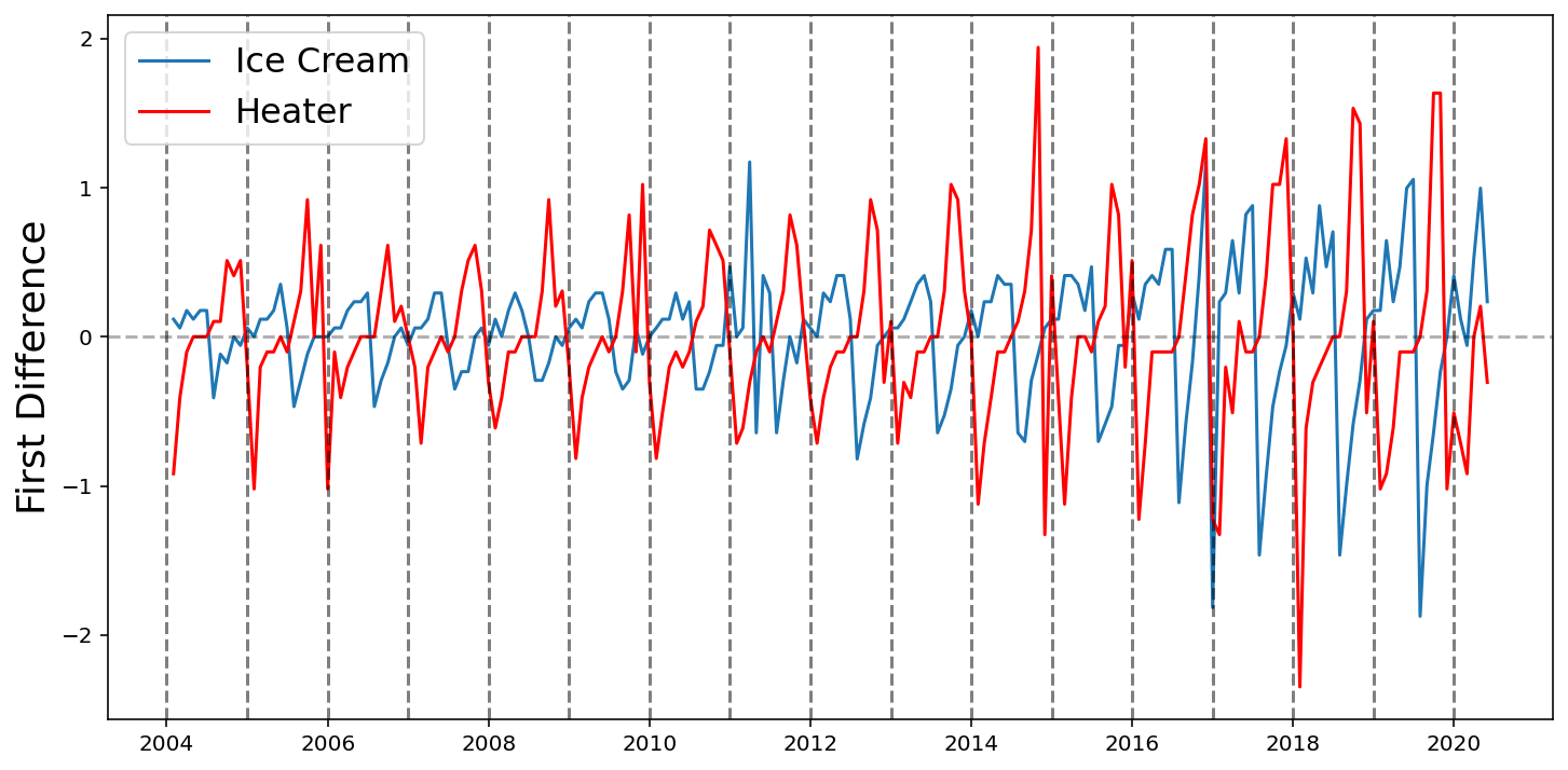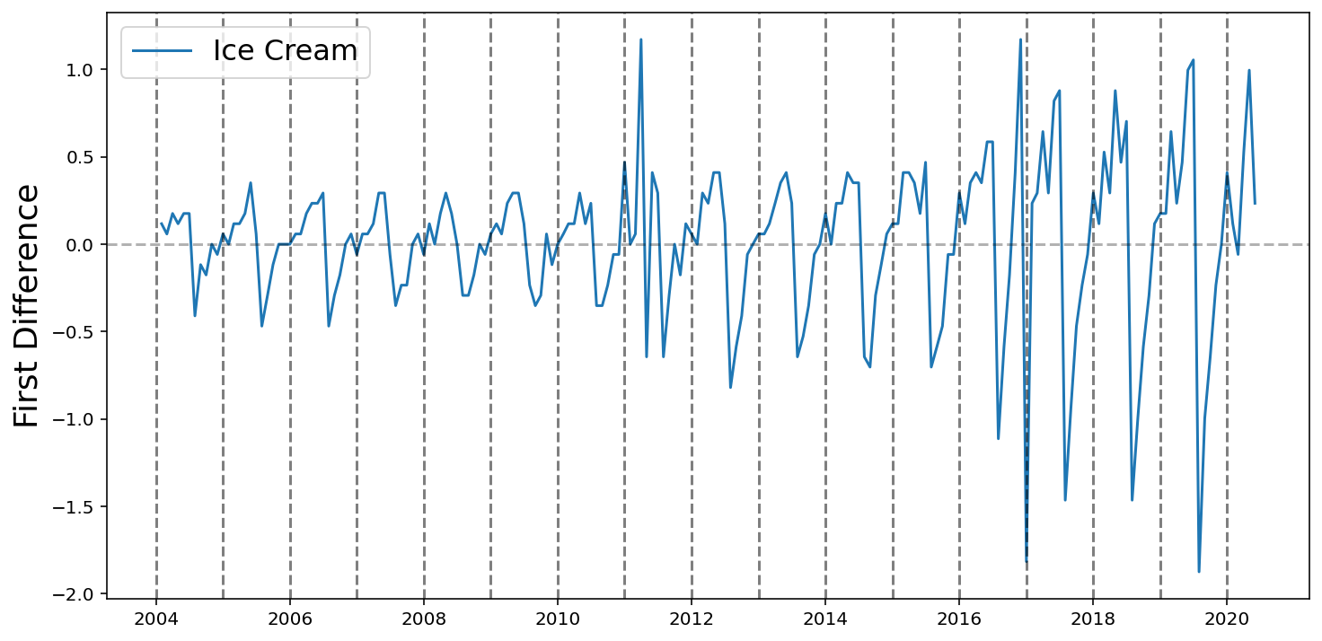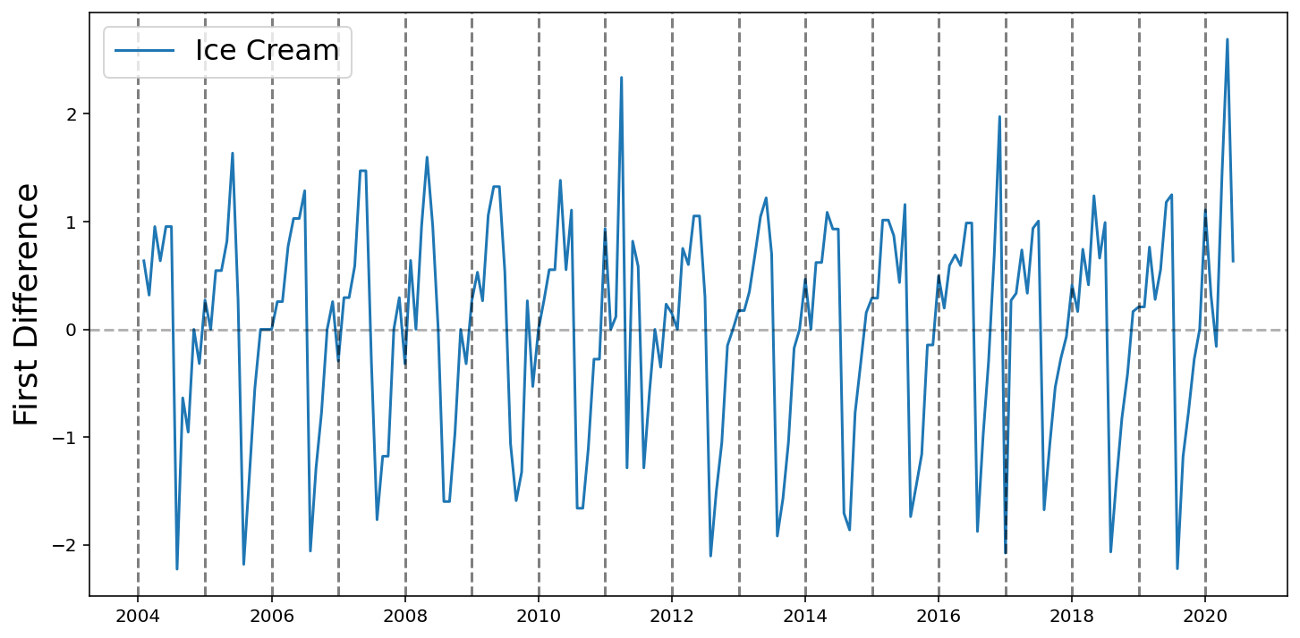def differentiate(values, d=1):# First value is required so that we can recover the original values with np.cumsum x = np.concatenate([[values[0]], values[1:]-values[:-1]])if d ==1:return xelse: return differentiate(x, d -1)