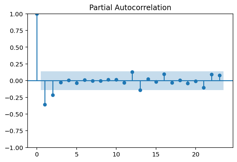 #Construyamos la serie de tiempo, solo un AR(1) simplet1 = [0.1*np.random.normal()]for _ inrange(100): t1.append(0.5*t1[-1] +0.1*np.random.normal())
